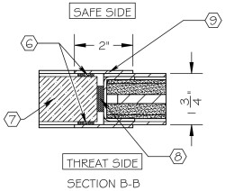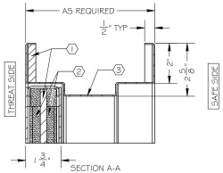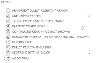 Bullet Resistant Hollow Metal door and frame assemblies are designed of “non-ricochet type” intended to permit capture and retention of attacking projectile, lessening potential of random injury or lateral penetration. Frame uses cold rolled steel prime painted steel which is cut then broken and welded to size. Frames includes armor installed in 2″ face to meet ballistic protection level. Door uses cold rolled steel prime painted steel skins with channel supported edges with ballistic armor and foam insulation inserted to meet ballistic protection level required. Assembly leaves factory swinging on frame using heavy duty clear anodized aluminum continuous gear hinge prepped for cylinder, mortise lockset or exit device.